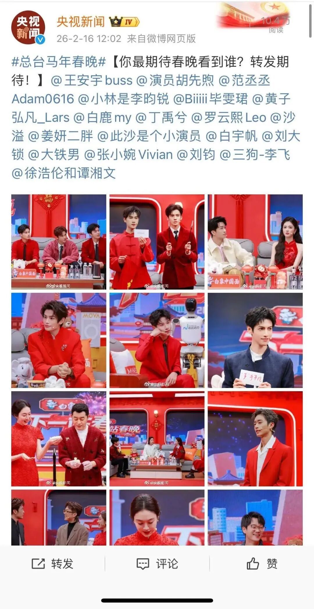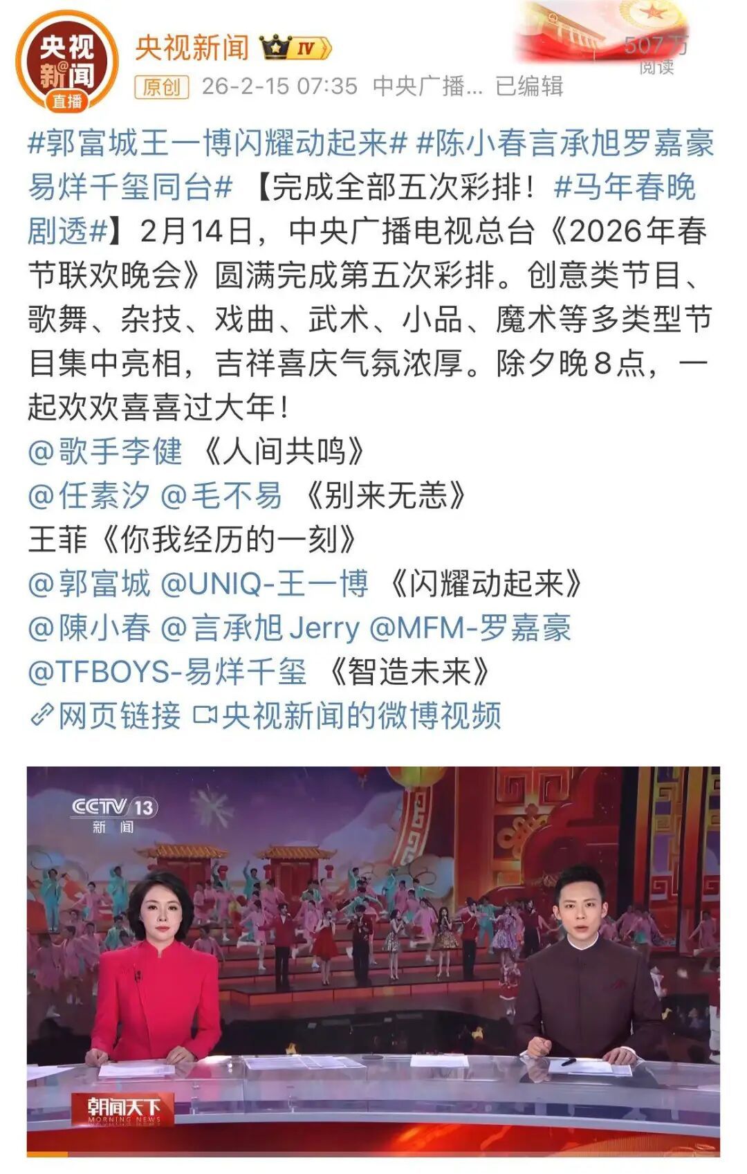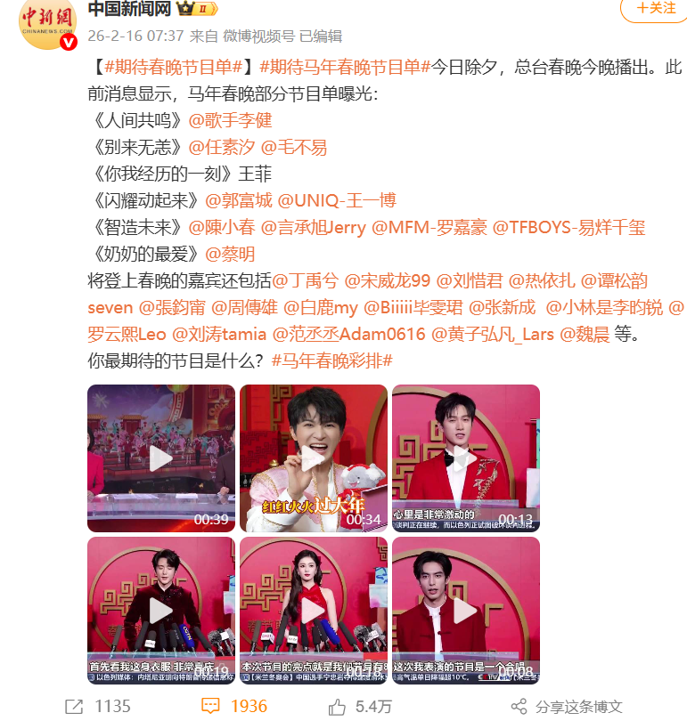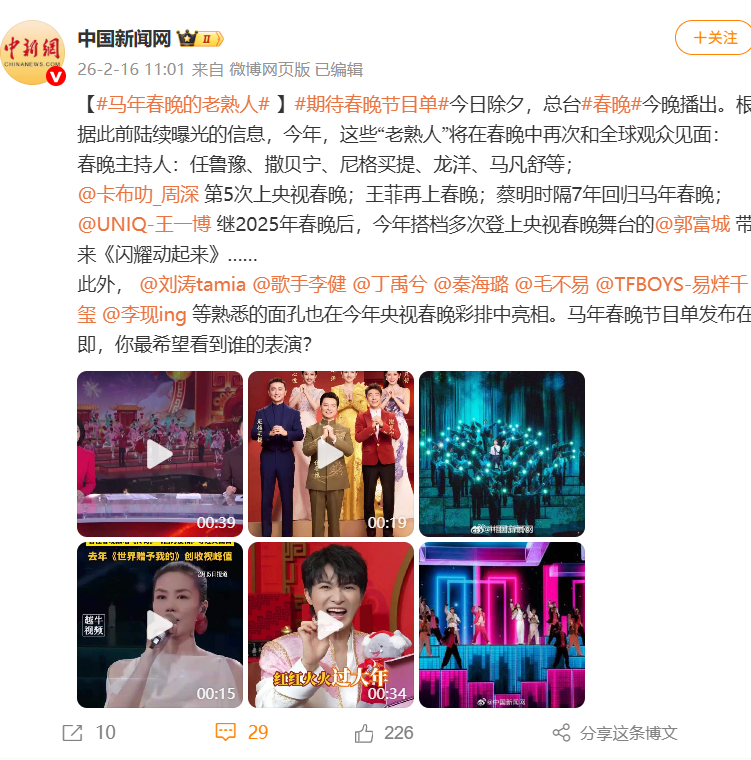 今日除夕,总台春晚今晚播出。此前消息显示,马年春晚部分节目单曝光: